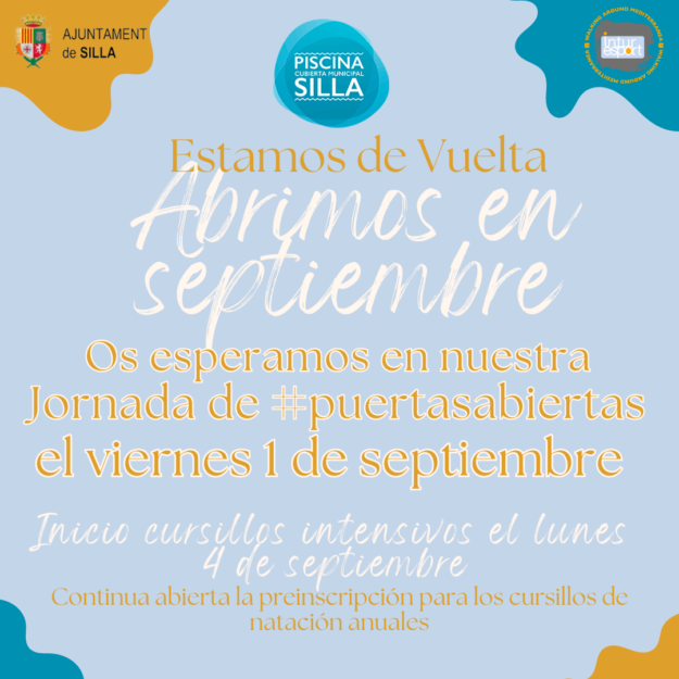 En la Piscina de Silla estamos de vuelta y lo queremos celebrar contigo. Por eso te invitamos este viernes, 1 de septiembre, a una gran Jornada de Puertas Abiertas. Además, os recordamos también que a parte de arrancar con todas las actividades dirigidas, sala y piscina, el próximo 4 de septiembre empiezan los cursillos intensivos…